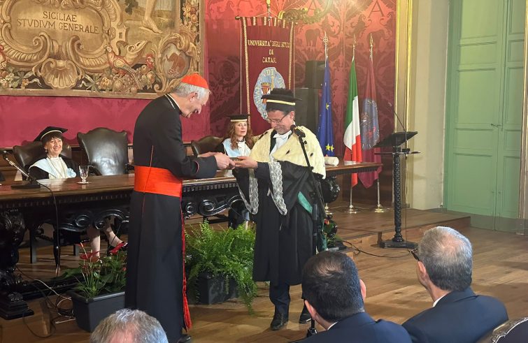 L’Università di Catania ha conferito al card. Matteo Maria Zuppi, presidente della Conferenza episcopale italiana, la laurea magistrale honoris causa in “Global Politics and Euro-Mediterranean Relations”. Un evento che evidenzia l’impegno dell’Ateneo etneo nella promozione della pace e del dialogo nel contesto del Mediterraneo e dell’Europa. “Siamo lieti di conferire la laurea al card. Zuppi, presidente della Cei”, ha detto il rettore Francesco Priolo. “Questo momento è di grande importanza per il nostro Ateneo, poiché la sua nomina riflette il nostro impegno per una politica orientata alla pace, che promuove il dialogo e la risoluzione dei conflitti, come unico modo per convivere in un mondo segnato da drammatiche sfide, specialmente nell’Europa e nel Mediterraneo. La sua leadership e il suo impegno per la pace sono un esempio ispiratore per tutti noi”. Il card. Zuppi, visibilmente emozionato, ha sottolineato l’importanza della cultura come strumento di pace. Ha poi ricordato il ruolo storico della Sicilia nel favorire la comprensione e la cooperazione nel Mediterraneo. “La Sicilia, con la sua ricca storia e profonde radici culturali, è sempre stata un cruciale crocevia di civiltà e un vivace centro di dialogo – ha detto Zuppi –. In questi tempi di conflitti globali e sfide, è più importante che mai impegnarsi nel dialogo e nella comprensione per costruire una pace duratura”. Zuppi ha rimarcato che il patrimonio culturale diversificato del bacino del Mediterraneo è una risorsa inestimabile che contribuisce alla pace e alla comprensione reciproca. “La pace, che tutti noi abbiamo ereditato dopo la tragedia della Seconda Guerra mondiale, ha bisogno di manutenzione. Non dobbiamo darla per scontata, dobbiamo lavorare affinché ciò che noi chiamiamo pace non sia invece soltanto una tregua. Se vogliamo la pace, dobbiamo affermare la forza del diritto, non quella delle armi, investendo tanto sulle realtà nazionali che possono garantire la composizione multilaterale dei conflitti e la cooperazione lungimirante tra i popoli e gli Stati”. Il card. Zuppi ha anche affrontato il ruolo non politico della Chiesa in queste questioni, sostenendo una Europa che tuteli la vita e i diritti civili, enfatizzando i valori fondamentali di pace e solidarietà. “In conclusione – ha detto il presidente della Cei – dobbiamo tutti essere artigiani di pace, ricordando che la costruzione di un futuro migliore richiede impegno, conoscenza e rispetto reciproco. L’Europa e il mondo hanno bisogno di più di questo spirito, ora più che mai”. Tanti gli ospiti che hanno riempito l’aula magna del Palazzo centrale dell’Università di Catania: il ministro Nello Musumeci, il presidente dell’Ars Gaetano Galvagno, l’arcivescovo di Catania, Luigi Renna, il vescovo di Acireale, Antonino Raspanti, l’arcivescovo emerito Salvatore Gristina, il prefetto Maria Carmela Librizzi e numerose altre autorità religiose, accademiche, civili e militari.