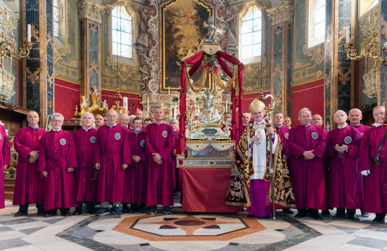 Alla processione di quest’anno, la Confraternita sacramentale di Bressanone ha indossato per la prima volta le nuove vesti talari. Al termine del rito, il vescovo ha benedetto i nuovi paramenti di colore viola dei 56 confratelli.