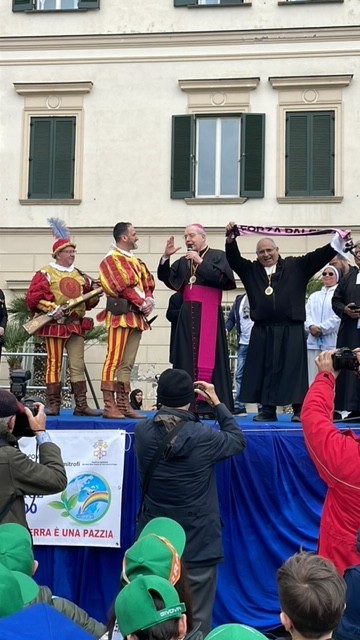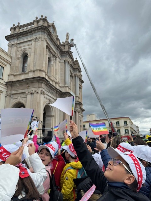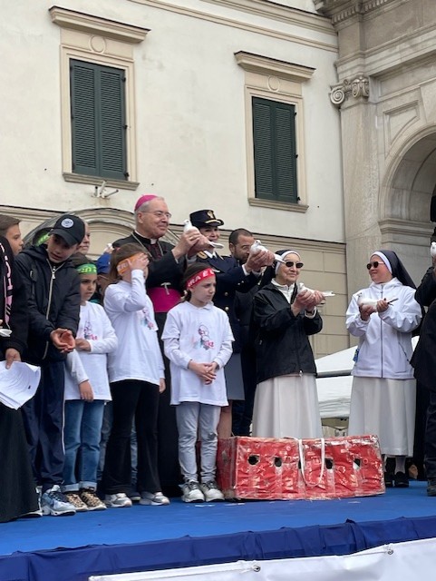 Il primo tratto percorso dal corteo si è concluso in piazza Bartolo Longo, sul sagrato della basilica, dove ad accoglierli c’era l’arcivescovo di Pompei, mons. Tommaso Caputo. “Oggi sarete voi i nostri insegnanti!”, ha detto loro il presule, “sarete voi a salire in cattedra e a dire a noi, oggi vostri alunni, che la guerra è una pazzia! Questa notte è giunta la notizia che ci sono stati altri attacchi in Iran. Voi siete qui oggi a festeggiare, cantare, ballare, come è giusto che sia, ma immaginate che in questo stesso momento tanti bambini e ragazzi come voi non possono fare altrettanto perché vittime di questi attacchi, vivendo in territori attualmente coinvolti in conflitti e guerre. Dunque, la guerra è una pazzia! Siate sempre costruttori di pace!”.
