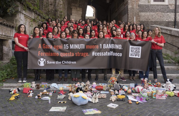 “Pensare che circa ogni 15 minuti un bambino perda la vita, ci fa capire quanto questa guerra sia tra le più letali e distruttive della storia recente”. Lo ha dichiarato oggi la direttrice di Save the Children Daniela Fatarella, in occasione dell’esposizione da parte dello staff locale di uno striscione e di una serie di oggetti davanti alla sede di Roma, che rappresentano l’infanzia negata dei bambini nelle zone di conflitto. “In sei mesi di conflitto – ha aggiunto Fatarella -, circa 26mila bambini sono stati uccisi o feriti, mentre coloro che sono sopravvissuti hanno perso la casa, gli affetti, la scuola, la loro vita quotidiana e oggi stentano a sopravvivere per la fame. Tutto questo è inaccettabile: il mondo deve agire ora per garantire un cessate il fuoco immediato e definitivo e un accesso umanitario senza restrizioni. Ogni oggetto che abbiamo deposto oggi vicino alla nostra sede vuole ricordare queste piccole vite spazzate via, ma al tempo stesso tutto il bello che dovrebbe popolare la vita di un bambino, in cui non dovrebbe esserci spazio per violenza e morte”. Save the Children fornisce sostegno ai bambini palestinesi dal 1953. Secondo l’organizzazione circa 30 dei 36 ospedali di Gaza sono stati bombardati e il sistema sanitario è al collasso. Il conflitto ha danneggiato il 90% degli edifici scolastici e metà della popolazione sta affrontando un livello catastrofico di insicurezza alimentare, con zone come il nord del Paese che rischiano la carestia.