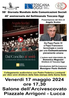 È in programma per venerdì 17 maggio, alle 17,30 nel salone del palazzo arcivescovile di Lucca, l’incontro dal titolo “Da Paolo VI a Francesco, tecnologia e cuore per una comunicazione pienamente umana”, per interrogarsi su quanto sia cambiata la comunicazione della Chiesa negli ultimi decenni, e della centralità del Concilio vaticano. L’appuntamento, organizzato dalla diocesi di Lucca assieme a Toscana Oggi e Ucsi-Unione cattolica stampa italiana della Toscana, vedrà l’introduzione ed i saluti del vescovo mons. Paolo Giulietti, seguiti dalla presentazione del libro “Dal Concilio al web. La comunicazione vaticana e la svolta della riforma” (Libreria Editrice Vaticana, 2023), di Angelo Scelzo, giornalista de L’Osservatore Romano, Sala Stampa Vaticana e Pontificio Consiglio delle Comunicazioni sociali. Moderatore dell’incontro Domenico Mugnaini, direttore di Toscana Oggi, che dirigerà anche il collegamento con il gesuita p. Federico Lombardi direttore della Sala Stampa Vaticana dal 2006 al 2016, sotto i pontificati di Benedetto XVI e Francesco.