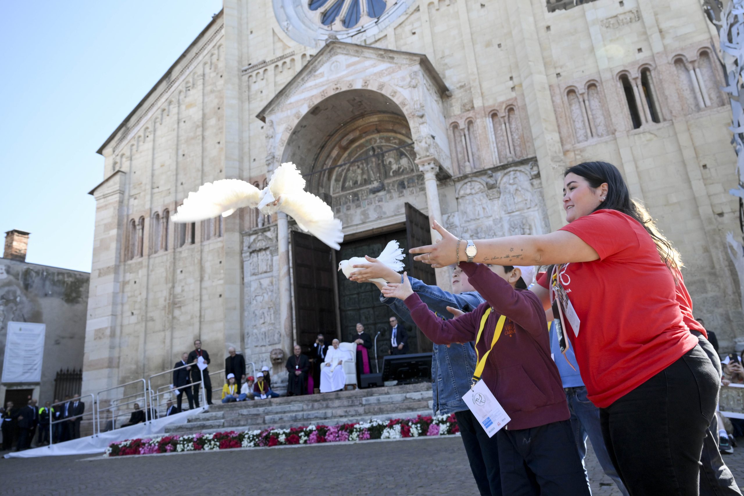 “Noi come possiamo essere segni di pace nel mondo? Ci sono tante guerre oggi: Ucraina, Terra Santa, Africa, Myanmar. Tante guerre e Gesù predica la pace. Dobbiamo essere un segno di pace ma se tu litighi con il compagno sei segno di pace?”. Lo ha detto Papa Francesco, nel suo incontro con i bambini e i ragazzi riuniti in piazza San Zeno, davanti la basilica, al termine dell’incontro con i sacerdoti.