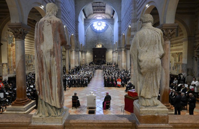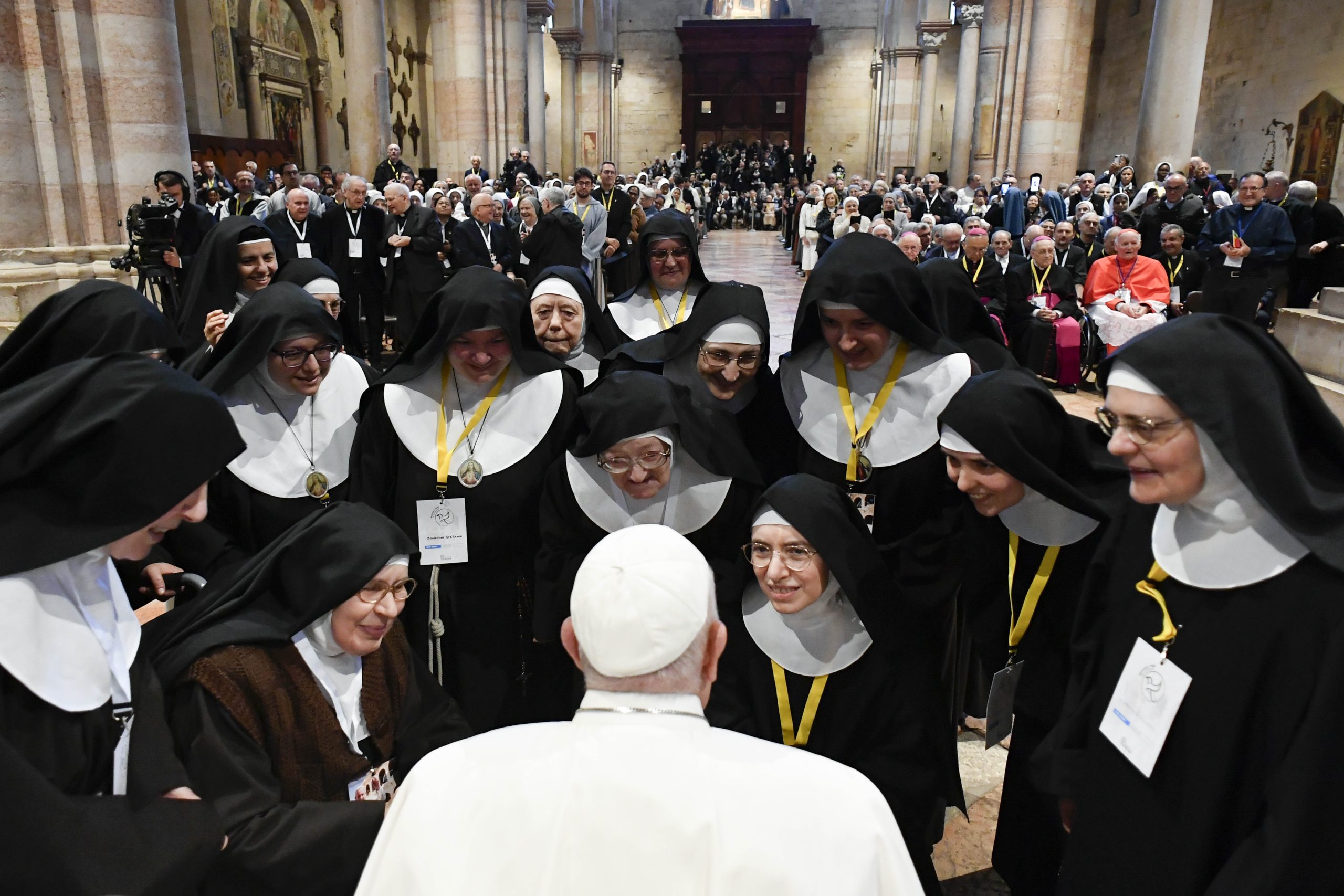“L’audacia di una fede operosa nella carità, voi l’avete ereditata dalla vostra storia”. Lo ha detto Papa Francesco incontrando sacerdoti e consacrati nella basilica di San Zeno, nel corso della sua visita a Verona. “Non cedete allo scoraggiamento – li ha incoraggiati –: siate audaci nella missione, sappiate ancora oggi essere una Chiesa che si fa prossima, che si avvicina ai crocicchi delle strade, che cura le ferite, che testimonia la misericordia di Dio. È in questo modo che la barca del Signore, in mezzo alle tempeste del mondo, può portare in salvo tanti che altrimenti rischiano di naufragare”.