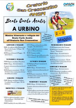 “Un grande evento per Urbino: l’arrivo delle reliquie del beato Carlo Acutis!”. Ad annunciarlo una nota diffusa oggi dalla diocesi di Urbino-Urbania-Sant’Angelo in Vado. Le reliquie arriveranno oggi, giovedì 2 maggio, con l’accoglienza prevista per le ore 18, nella chiesa della Ss. Annunziata. Le reliquie resteranno fino al 9 maggio. La chiesa sarà aperta ogni giorno per la visita dalle ore 9 alle ore 23. Ad ogni santa messa saranno raccolti viveri per i bisognosi, così fece Carlo Acutis nella sua breve vita: essere vicino ai poveri. Durante tutta la settimana, in chiesa, sarà allestita una “cassetta della posta” per poter lasciare intenzioni di preghiera.