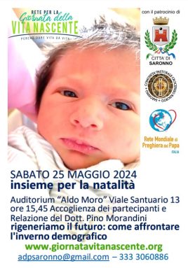 La Rete per la Giornata della vita nascente (che raccoglie 40 associazioni pro-life sia cattoliche che laiche), la Rete mondiale di preghiera del Papa (Apostolato della preghiera), con il patrocinio del Comune di Saronno (Varese) e della Comunità pastorale Crocifisso risorto di Saronno, organizzano per il pomeriggio di sabato 25 maggio (ore 16.00-18.15), presso l’auditorium Aldo Moro di Saronno, una conferenza dal titolo “Insieme per la natalità”, che avrà per relatore Pino Morandini, studioso ed esponente del mondo pro-life nazionale. Modererà l’incontro Raffaele Pier Luca Di Francisca, referente per l’ecumenismo e il dialogo interreligioso nella Rete per la Giornata della vita nascente. “Sono invitati a partecipare – si legge in una nota – innanzitutto i responsabili delle istituzioni che saranno toccate progressivamente dalle conseguenze del calo demografico, perché il tema della natalità tocca inesorabilmente tutti i settori della società ma in special modo quelli che si occupano di infanti, bambini, ragazzi, giovani e in futuro toccherà coloro che adesso sono adulti”. L’iniziativa “è culturale e non ha nessuno scopo né di lucro, né ideologico, né politico, né religioso ma vuole porre al centro una questione di sopravvivenza della società”.