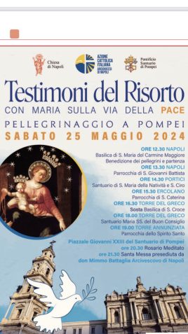 “Testimoni del Risorto. Con Maria sulla via della pace” è il tema che guiderà i fedeli della Chiesa di Napoli che partiranno, a piedi, alla volta di Pompei, alle 12.30 di domani, sabato 25 maggio, dalla basilica del Carmine Maggiore. Numerosi i fedeli che si aggiungeranno durante il tragitto che vedrà i pellegrini attraversare Portici, Ercolano, Torre del Greco e Torre Annunziata per giungere nella città mariana in serata e recitare il santo rosario alle 20.30 nel piazzale “San Giovanni XXIII” dove saranno accolti dall’arcivescovo di Pompei, mons. Tommaso Caputo. Poi, alle 21.30, l’arcivescovo di Napoli, mons. Mimmo Battaglia, presiederà la celebrazione eucaristica che concluderà il pellegrinaggio organizzato dall’Azione cattolica.