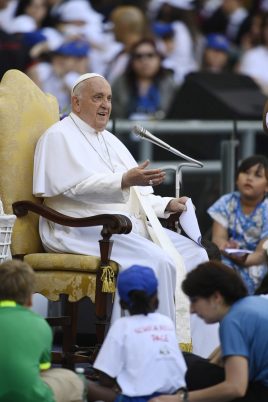 “So che siete tristi per le guerre. Voi siete tristi per le guerre?”. Sono le parole rivolte dal Papa, dialogando con i 70mila bambini che affollano lo Stadio Olimpico per la prima Giornata mondiale dei bambini, che continuerà domani in piazza San Pietro. “La guerra è una cosa bella, e la pace è una cosa bella?”, ha chiesto ancora il Santo Padre: “Siete addolorati perché tanti vostri coetanei non possono andare a scuola, per i bambini che soffrono le guerre, per i bambini che sono ammalati perché nessuno li cura”. Poi Francesco ha esortato i bambini a ripetere insieme il motto della Giornata mondiale dei bambini: “Ecco, io faccio nuove tutte le cose”. “Dio vuole questo, Dio è novità, sempre il Signore ci dà la novità”, ha proseguito a braccio: “Gesù nel Vangelo vi ha detto che vi vuole bene”. “Gesù vi vuole bene?”. “Sì”. “E il diavolo vi vuole bene?”. “No!”. “Coraggio e avanti”.