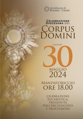 È in programma per giovedì 30 maggio a Mandatoriccio, la celebrazione del Corpus Domini della diocesi di Rossano-Cariati, che prevede prima la messa celebrata dal vescovo mons. Maurizio Aloise, e di seguito la processione. In mattinata il ritiro dei sacerdoti nel centro di Campana. Tradizionalmente, ogni anno la diocesi calabrese è solita tenere solennità del Santissimo Corpo e Sangue di Cristo in punti diversi del territorio diocesano, con l’intento di essere presenti anche in luoghi più decentrati come testimonianza di fede e presenza, di vicinanza e ascolto, in piena aderenza anche con il cammino sinodale. Quest’anno la processione del Corpus Domini sarà accolta a Mandatoriccio. Alle ore 18:00 ci sarà la celebrazione eucaristica presieduta da S. E. l’Arcivescovo Monsignor Maurizio Aloise a cui seguirà la processione. Sarà una giornata intensa, di preghiera e raccoglimento, preceduta al mattino dal ritiro dei sacerdoti che si terrà nel centro di Campana.