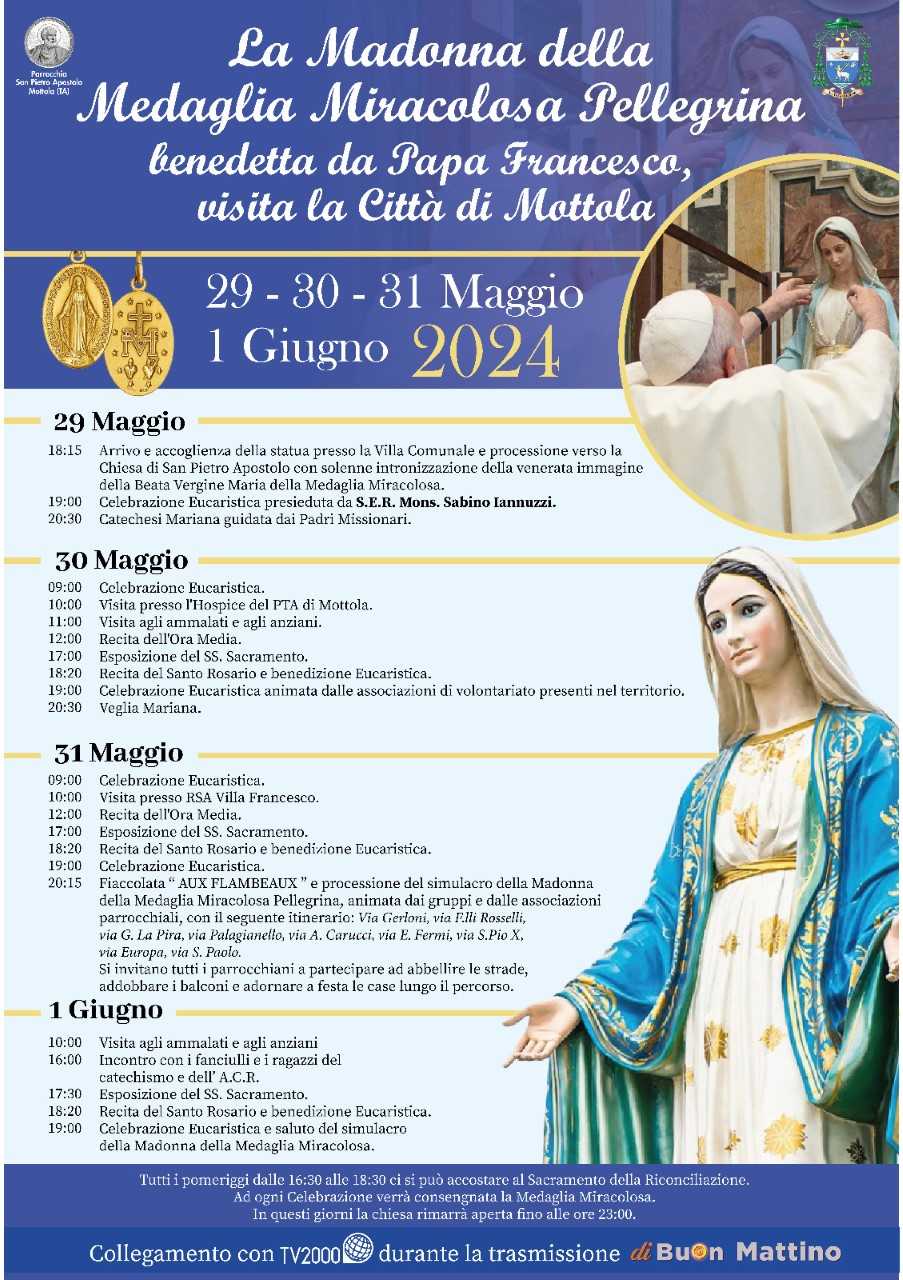 Mercoledì 29 maggio, alle 18.15, l’arrivo e l’accoglienza della statua presso la Villa comunale e processione alla chiesa di San Pietro Apostolo con solenne intronizzazione della venerata immagine della Beata Vergine Maria della Medaglia Miracolosa; alle 19 la celebrazione eucaristica presieduta da mons. Iannuzzi; alle 20.30 catechesi mariana guidata dai padri missionari. Giovedì 30 maggio alle 9 celebrazione eucaristica; alle 10 visita presso l’Hospice del Pta di Mottola; alle 11 visita agli ammalati e agli anziani; alle 12 recita dell’Ora media; alle 17 esposizione del SS. Sacramento; alle 18:20 recita del rosario e benedizione eucaristica; alle 19 celebrazione eucaristica animata dalle associazioni di volontariato presenti nel territorio; alle 20.30 veglia mariana. Il 31 maggio alle 9 celebrazione eucaristica; alle 10 visita presso Rsa Villa Francesco; alle 12 Ora media; alle 17 esposizione del SS. Sacramento; alle 18:20 recita del rosario e benedizione eucaristica; alle 19 messa e alle 20.15 fiaccolata “Aux Flambeaux” e processione della statua della Madonna della Medaglia Miracolosa Pellegrina. Sabato 1° giugno, alle 10 visita agli ammalati e agli anziani; alle 16 incontro con i fanciulli e i ragazzi del catechismo e della Acr.; alle 17:30 esposizione del SS. Sacramento; alle 18:20 recita del rosario e benedizione eucaristica; alle 19 celebrazione eucaristica e saluto della statua.