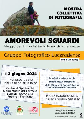È in programma il 1° e il 2 giugno a Fiumicino, nel Centro di spiritualità Maria Madre del Carmelo in viale di Focene 434, la mostra collettiva di fotografia “Amorevoli sguardi”, organizzata dal Gruppo fotografico Luceradente – BFI (FIAF 1996) e la Scuola della tenerezza delle diocesi di Porto-Santa Rufina e di Civitavecchia-Tarquinia. La mostra, a ingresso libero, è aperta dalle 10 alle 19 e sarà presentata il 1° giugno alle 18.30. Sono 48 le immagini selezionate tra le oltre 200 presentate da 23 autori diversi che hanno interpretato le diverse forme di tenerezza. Questi i nomi degli autori: Angelo Mura, Antonio Garavini, Benedetto Tari, Carlo Rampioni, Emanuela Morelli, Emanuela Tettoia, Fabrizio Ignesti, Flavia Pollonio, Francesca Mariani, Francesco Betti, Giuseppe Di Lorenzo, Giuseppe Farcomeni, Ivo Caffarelli, Luigino Petriglia, Massimo Pezzanera, Mauro Micozzi, Palma Navarrino, Paolo Scrimitore, Rosaria Di Nunzio, Salvatore Franco, Stefano Mariani, Vincenzo Amarante, Vincenzo Santoro. La Scuola della tenerezza è un’idea di un gruppo di coppie delle diocesi di Porto-Santa Rufina e di Civitavecchia-Tarquinia, del vescovo mons. Gianrico Ruzza e di alcuni sacerdoti, con il desiderio di approfondire la spiritualità della tenerezza per valorizzare relazioni radicate nel Vangelo.