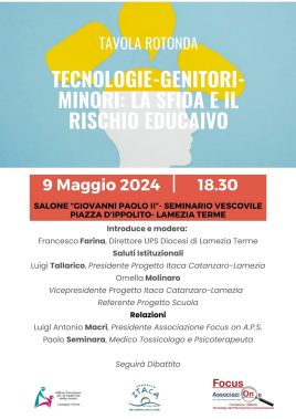 “Tecnologie-genitori-minori: la sfida ed il rischio educativo”. Questo il tema della tavola rotonda che, promossa dall’Ufficio diocesano per la pastorale della salute di Lamezia Terme in collaborazione con il “Progetto Itaca” – che tra la sua mission ha quello di “promuovere programmi di informazione, prevenzione, supporto e riabilitazione rivolti a persone affette da disturbi della salute mentale e alle loro famiglie” -, si terrà stasera, con inizio alle ore 18.30, nel salone “Giovanni Paolo II”. L’incontro, che sarà moderato dal direttore dell’Ufficio per la pastorale della salute, don Francesco Farina, affronterà le tematiche relative alla prevenzione delle dipendenze a seguito di disturbi dell’uso eccessivo di internet non tralasciando i rischi per la salute delle “nuove” abitudini dei giovani quali alcool e sostanze d’abuso. Temi, questi, che saranno approfonditi da Luigi Antonio Macrì, presidente dell’Associazione Focus on aps, e Paolo Seminara, medico tossicologico e psicoterapeuta.
