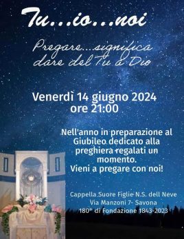È in programma per domani 14 giugno a Savona, alle ore 21, nella cappella della casa madre delle Figlie di Nostra Signora della Neve in via santa Maria Maggiore, la serata di preghiera “Tu… io… noi” in preparazione al Giubileo del 2025 “Pellegrini di speranza”. “Pregare significa dare del Tu a Dio. Nell’anno in preparazione al Giubileo dedicato alla preghiera regalatevi un momento per pregare insieme a noi!”, spiegano le suore nell’invito all’iniziativa.