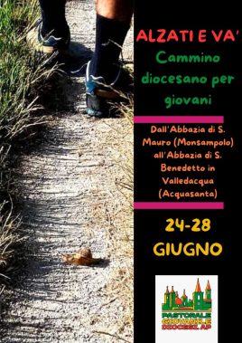 “Alzati e va’”: è il titolo del cammino diocesano per giovani, un cammino a piedi attraverso diverse parrocchie e territori della diocesi di Ascoli Piceno. Cinque giorni sui passi del cammino benedettino dall’abbazia di S. Mauro a Stella di Monsampolo fino ad arrivare all’abbazia di S. Benedetto in Valledacqua ad Acquasanta.