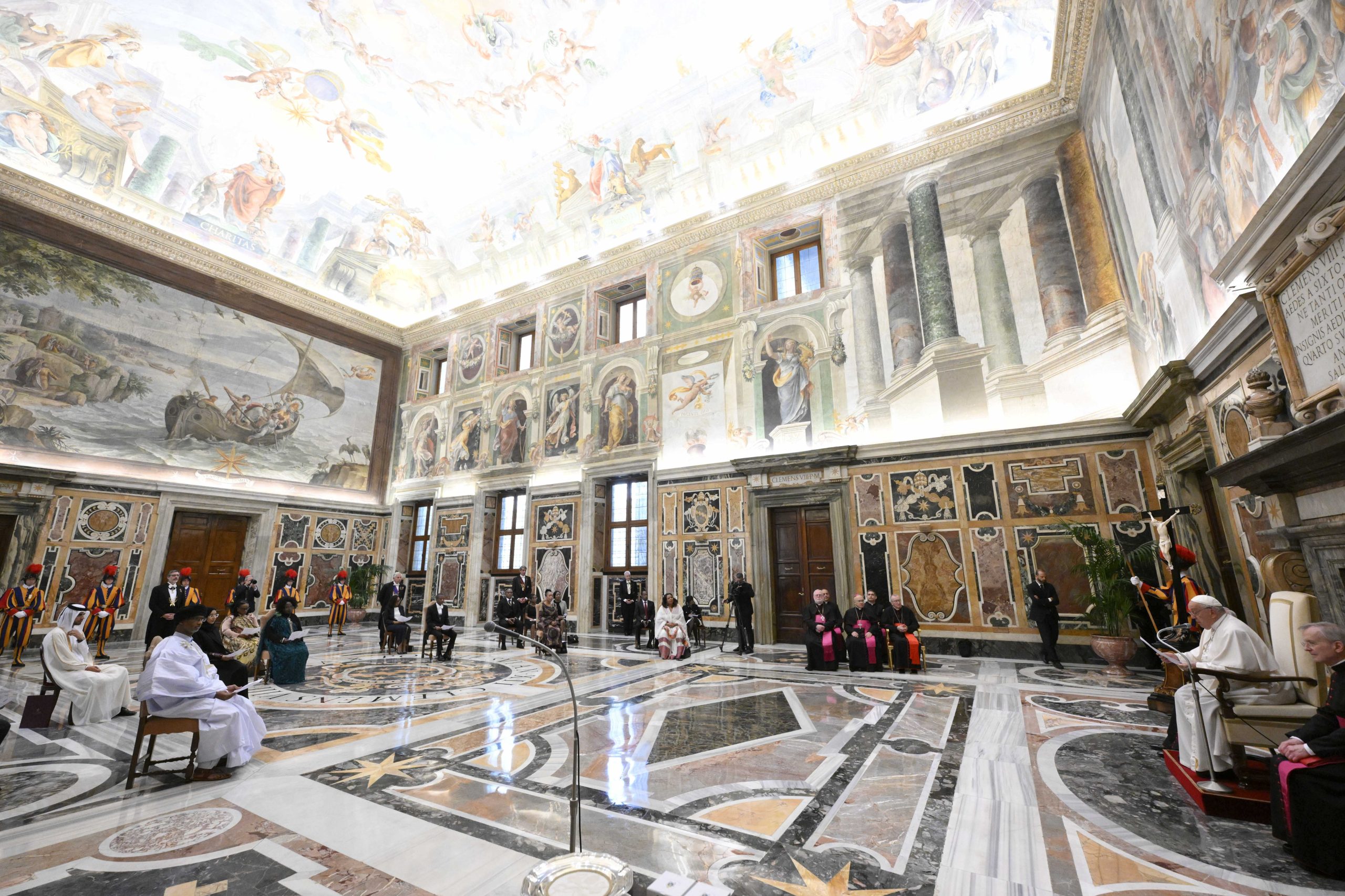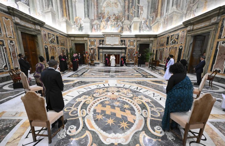 “La pace – la terza parola che vi offro – è ‘frutto di relazioni che riconoscono e accolgono l’altro nella sua inalienabile dignità’ (Messaggio per la Giornata mondiale della pace 2024). Solo quando mettiamo da parte l’indifferenza e la paura può fiorire un genuino clima di rispetto reciproco, che porti a una durevole concordia. La vostra presenza qui è un segno eloquente della volontà delle Nazioni che rappresentate e della Comunità internazionale nel suo complesso di affrontare le situazioni di ingiustizia, discriminazione, povertà, e disuguaglianza che affliggono il nostro mondo e che ostacolano le pacifiche aspirazioni delle generazioni presenti e future. È mio auspicio che nell’esercitare il vostro ruolo di diplomatici vi sforzerete sempre di essere costruttori di pace, quelli benedetti dall’Onnipotente (cfr Mt 5,9)”.