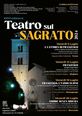 Prende il via la XXVI edizione del Teatro sul Sagrato, promossa nei quattro venerdì del mese di luglio dall’arcidiocesi di Fermo in collaborazione con alcuni comuni d’intesa con le parrocchie del territorio (Mogliano-San Gregiorio Magno, Montegiorgio-San Giovanni Battista e Nicolò, Morrovalle-San Bartolomeo Apostolo) e le Fondazioni Terzo Millennio e Cassa di risparmio di Fermo. Si inizia il 5 luglio, presso la cattedrale di Fermo, con “La storia di Francesco”, spettacolo scritto e diretto da Pino Quartullo, tratto dal romanzo “La sapienza di un povero” di Eloi Leclerc: si tratta di una produzione La Città degli artisti e di un progetto speciale varato dal Ministero della Cultura. Il 12 luglio sarà invece la volta di “Francesco”, scritto e diretto da Lorenzo Cognatti, a cura di Jobel, presso il chiostro di San Gregorio Magno a Mogliano. Il 19 luglio andrà invece in scena “Francesco, l’uomo nuovo”, performance di RadioTeatro con Luca Violini e Giovanni Seneca: l’appuntamento è al chiostro di Sant’Agostino, a Montegiorgio. L’ultimo evento è previsto per il 26 luglio, con il titolo “Amore senza misura”: uno spettacolo-concerto a cura di Viviana De Marco con canzoni, poesia e musica al sax, chitarra e tastiera.