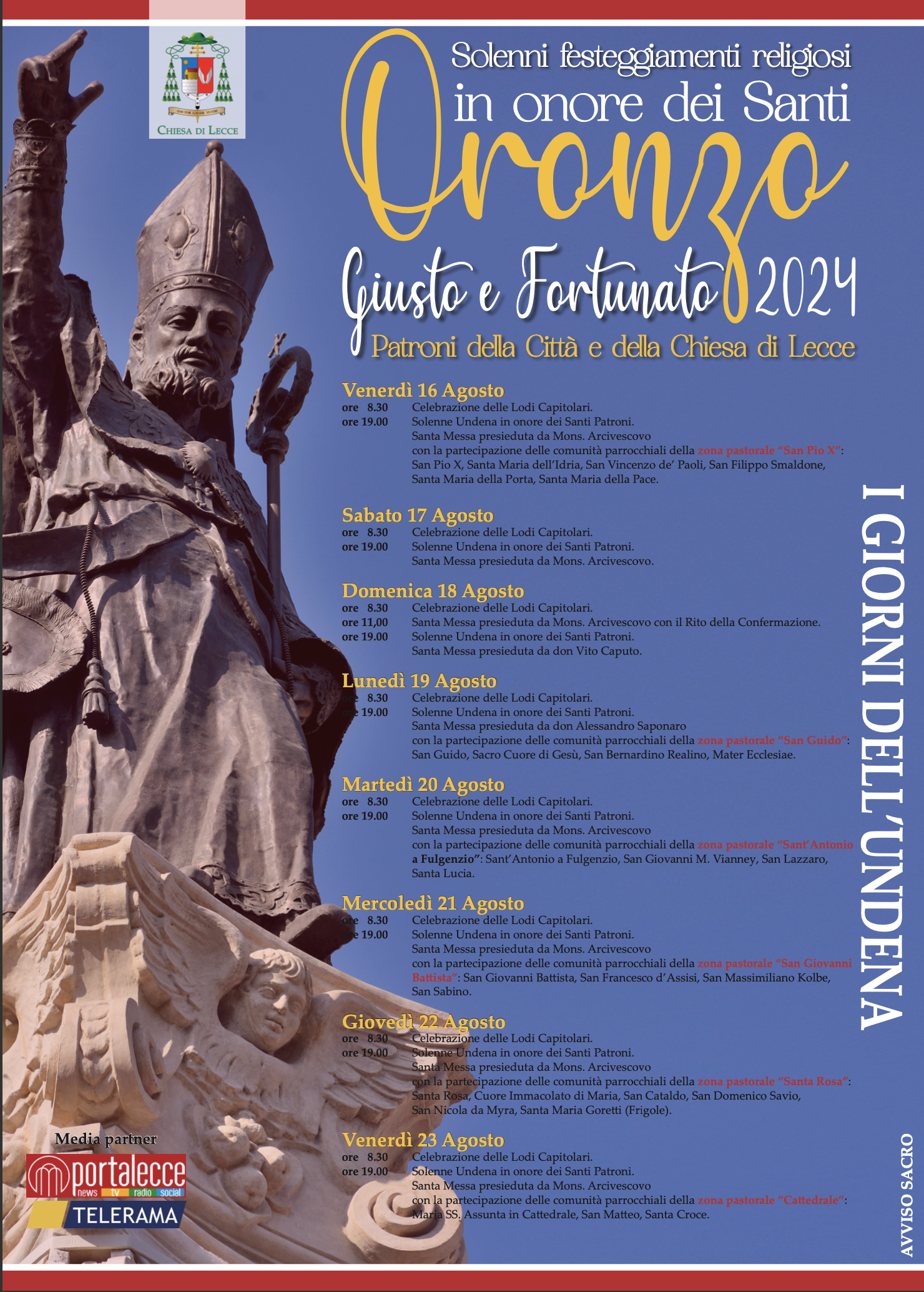 La diocesi di Lecce ha reso noto il programma dei festeggiamenti per il 2024 in onore dei santi Oronzo, Giusto e Fortunato, patroni della città capoluogo salentina e della Chiesa locale. Il 15 agosto avrà inizio la solenne undena con la messa alle 19 e, fino al 25 agosto, ogni mattina alle 8.30 le lodi mattutine capitolari e, la sera alle 19, la messa con la riflessione omiletica e la partecipazione delle comunità parrocchiali della città e l’adorazione eucaristica. Domenica 18 agosto, alle 20 in cattedrale, il concerto di musica sacra del gruppo vocale Viri Cantores de Finibus terrae. Il 20 agosto, alle 20 nel chiostro dell’antico seminario di piazza duomo, la presentazione del libro “La statua di Sant’Oronzo a Lecce tra arte e devozione” di Letizia Cerrati (Edizioni Grifo ed ArtWork), con gli interventi dell’arcivescovo Michele Seccia, del sindaco Adriana Poli Bortone, di Raffaele Casciaro e dei due editori. Sabato 24 agosto, alle 18.30, la processione solenne con i simulacri dei santi patroni che, dopo un momento di preghiera comunitaria in cattedrale, si muoverà per le vie del centro fino a piazza duomo, dove l’arcivescovo leccese pronuncerà il tradizionale messaggio alla città, trasmesso in diretta sulla pagina Facebook di Portalecce e su Telerama al canale 15. Domenica 25 agosto, alle 10.30, mons. Seccia presiederà la messa nel santuario di Sant’Oronzo fuori le mura, mentre alle 18.30 in cattedrale, celebrerà i primi vespri capitolari e la messa durante la quale il sindaco Poli Bortone, assieme all’amministrazione comunale e per conto delle parrocchie della vicaria della città, offrirà l’olio per la lampada votiva che arde tutto l’anno davanti all’altare del santo. Lunedì 26 agosto, solennità dei Santi Oronzo, Giusto e Fortunato, le messe in cattedrale saranno alle 8, 9.30 e 11, quest’ultima presieduta da mons. Seccia, mentre alle 19 i secondi vespri capitolari ed alle 20 la messa presieduta dal card. Angelo De Donatis, trasmessa in diretta sulla pagina Facebook di Portalecce e sul canale 15 di Telerama. Martedì 27 agosto alle 19 in cattedrale, la messa di ringraziamento presieduta dall’arcivescovo Seccia.