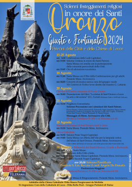 La diocesi di Lecce ha reso noto il programma dei festeggiamenti per il 2024 in onore dei santi Oronzo, Giusto e Fortunato, patroni della città capoluogo salentina e della Chiesa locale. Il 15 agosto avrà inizio la solenne undena con la messa alle 19 e, fino al 25 agosto, ogni mattina alle 8.30 le lodi mattutine capitolari e, la sera alle 19, la messa con la riflessione omiletica e la partecipazione delle comunità parrocchiali della città e l’adorazione eucaristica. Domenica 18 agosto, alle 20 in cattedrale, il concerto di musica sacra del gruppo vocale Viri Cantores de Finibus terrae. Il 20 agosto, alle 20 nel chiostro dell’antico seminario di piazza duomo, la presentazione del libro “La statua di Sant’Oronzo a Lecce tra arte e devozione” di Letizia Cerrati (Edizioni Grifo ed ArtWork), con gli interventi dell’arcivescovo Michele Seccia, del sindaco Adriana Poli Bortone, di Raffaele Casciaro e dei due editori. Sabato 24 agosto, alle 18.30, la processione solenne con i simulacri dei santi patroni che, dopo un momento di preghiera comunitaria in cattedrale, si muoverà per le vie del centro fino a piazza duomo, dove l’arcivescovo leccese pronuncerà il tradizionale messaggio alla città, trasmesso in diretta sulla pagina Facebook di Portalecce e su Telerama al canale 15. Domenica 25 agosto, alle 10.30, mons. Seccia presiederà la messa nel santuario di Sant’Oronzo fuori le mura, mentre alle 18.30 in cattedrale, celebrerà i primi vespri capitolari e la messa durante la quale il sindaco Poli Bortone, assieme all’amministrazione comunale e per conto delle parrocchie della vicaria della città, offrirà l’olio per la lampada votiva che arde tutto l’anno davanti all’altare del santo. Lunedì 26 agosto, solennità dei Santi Oronzo, Giusto e Fortunato, le messe in cattedrale saranno alle 8, 9.30 e 11, quest’ultima presieduta da mons. Seccia, mentre alle 19 i secondi vespri capitolari ed alle 20 la messa presieduta dal card. Angelo De Donatis, trasmessa in diretta sulla pagina Facebook di Portalecce e sul canale 15 di Telerama. Martedì 27 agosto alle 19 in cattedrale, la messa di ringraziamento presieduta dall’arcivescovo Seccia.