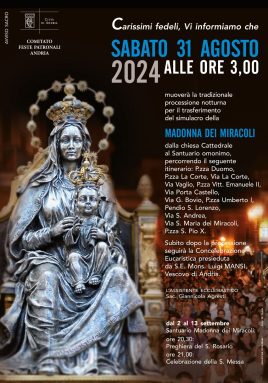 Sabato 31 agosto, alle ore 3, nella diocesi di Andria, muoverà la tradizionale processione notturna per il trasferimento del simulacro della Madonna dei Miracoli, dalla chiesa cattedrale al santuario omonimo, percorrendo il seguente itinerario: piazza Duomo, piazza La Corte, via La Corte, via Vaglio, p.zza Vittorio Emanuele II, via Porta Castello, via G. Bovio, piazza Umberto I, Pendio San Lorenzo, via S. Andrea, via S. Maria dei Miracoli, piazza S. Pio X.