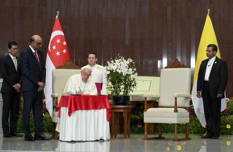 “Come la stella che guidò i Magi, così la luce della sapienza orienti sempre Singapore nella costruzione di una società unita e capace di trasmettere speranza”. Sono le parole vergate a mano dal Papa, nella firma del Libro d’Onore durante la cerimonia di benvenuto alla Parliament House di Singapore, dove è arrivato alle 9 (le 3 ora di Roma). Al suo arrivo il Papa è stato accolto dal presidente della Repubblica di Singapore, Tharman Shanmugaratnam. Dopo la Guardia d’Onore, l’esecuzione degli inni e l’Onore alle Bandiere, ha avuto luogo la presentazione delle delegazioni a cui ha fatto seguito la Firma del Libro d’Onore. Al termine della cerimonia di benvenuto, Papa Francesco ha raggiunto la Temasek Room, luogo della visita di cortesia al Presidente, alla presenza della delegazione del Papa e di quella presidenziale. Dopo l’incontro e la foto ufficiale con il presidente della Repubblica, alle ore 9.55 (3.35 ora di Roma) il Papa ha incontrato il Primo Ministro, Wong Shyun Tsai, alla presenza della Delegazione vaticana e di quella di Singapore. Al termine il Papa, preceduto dal Primo Ministro, si è trasferisce in auto alla National University of Singapore per l’incontro con le autorità e il suo primo discorso della quarta e ultima tappa del viaggio in Asia e Oceania.