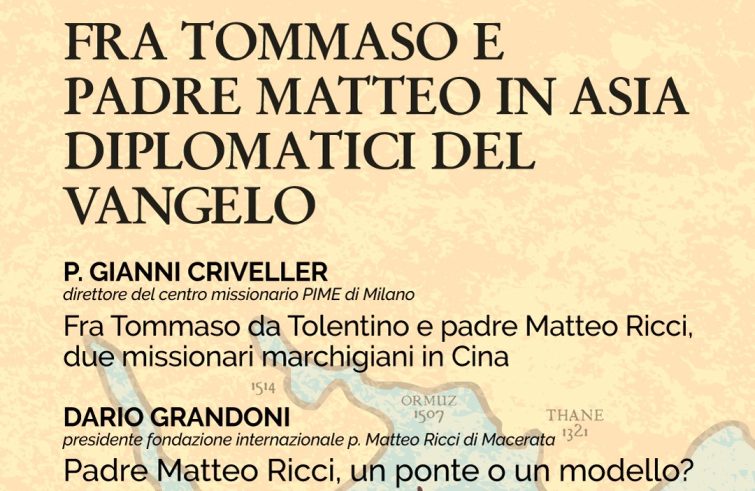 “Fra Tommaso e padre Matteo, in Asia diplomatici del Vangelo”. E’ il titolo dell’incontro che si terrà, mercoledì 25 settembre a Tolentino presso la Basilica di San Nicola per conoscere fra Tommaso da Tolentino e p. Matteo Ricci, sue missionari marchigiani in Cina. All’incontro (ore 21.15) interverranno il missionario e sinologo p. Gianni Criveller, direttore del Centro missionario del Pime (Pontificio Istituto Missioni Estere), direttore del giornale online Asianews, che concentrerà il proprio intervento sulla loro azione missionaria ed il prof. Dario Grandoni, docente di ‘Business Startup e Corporate Finance’ all’Università Politecnica delle Marche e presidente della Fondazione internazionale ‘P. Matteo Ricci’ di Macerata, che svilupperà la figura del gesuita maceratese: ‘Padre Matteo Ricci, un ponte o un modello?’. L’incontro – informa una nota – è preludio al convegno del convegno internazionale su ‘Marco Polo e i Francescani in Oriente’ che si svolgerà sempre a Tolentino nei giorni 18 e 19 ottobre.