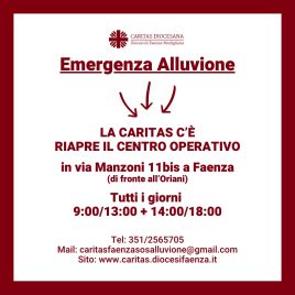 Il centro operativo ha sede a Faenza, presso la parrocchia di San Domenico (in via Manzoni 11 bis, di fronte all’istituto Oriani). Come la volta precedente, infatti, il centro operativo intende coordinare gli aiuti dei molti volontari, operando in rete con gli enti pubblici che fronteggiano l’emergenza e collaborando con le altre realtà della Chiesa (Comunità Papa Giovanni XXIII, Operazione Mato Grosso) impegnate nella solidarietà e nell’assistenza. Centrale sarà la distribuzione di macchinari (pompe, gruppi elettrogeni, idropulitrici,…) e di materiali (stivali, pale, tiracqua,…) per riqualificare gli edifici colpiti dall’alluvione. Importante è in questa fase il ruolo delle Caritas parrocchiali, “fondamentali – spiegano da Caritas Faenza – per la distribuzione di prodotti per le famiglie, quali quelli per l’igiene o viveri. Le Caritas parrocchiali sono attive fin dalle prime ore dell’emergenza e si prendono cura delle relazioni che già si erano instaurate durante lo scorso anno. Il centro operativo funzionerà da punto di raccolta di prodotti che, poi, verranno ridistribuiti dalle Caritas parrocchiali”. I giovani volontari della Caritas diocesana di Faenza, “si sono subito rimboccati le maniche di fronte alla nuova alluvione. I primi sono intervenuti fin da subito, nella stessa giornata del 19 settembre, a favore di Marzeno, una delle località che ha subito di più i danni dell’alluvione, per ripulire il fango dalle case e dalle strade. Da Marradi fino ad Alfonsine, dieci dei 12 Comuni della diocesi registrano criticità. A monitorare la situazione delle località, sono sempre le varie Caritas parrocchiali”.