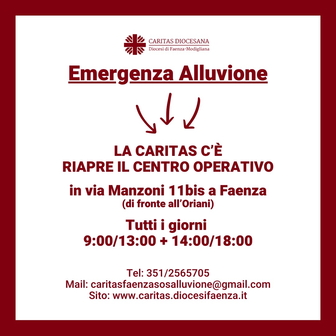 Il centro in questo primo periodo sarà aperto tutti i giorni dalle 9 alle 13 e dalle 14 alle 18. Contatti, fa sapere la diocesi, possono essere presi, preferibilmente via Whatsapp, tramite il numero 3512565705 o scrivendo alla email: caritasfaenzasosalluvione@gmail.com. Inoltre, si possono compilare online moduli google per richiedere supporto oppure offrire la propria disponibilità, reperibili sul sito www.caritas.diocesifaenza.it. Dalla diocesi, infine, viene sottolineata l’importanza della raccolta fondi in supporto alla Caritas. Le donazioni possono avvenire tramite bonifico o anche Satispay. Tutte le informazioni sempre sul sito: www.diocesifaenza.it