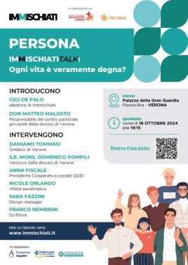 “Immischiati! Non guardare la vita dal balcone, mettiti in gioco!”. È l’invito che viene dal progetto “Immischiati”, che campeggia sul portale nato ad hoc per l’iniziativa. “Immischiati” è oggi un format e una enciclopedia digitale accessibile sulla Dottrina sociale della Chiesa, con oltre 8mila iscritti in tutta Italia. Il progetto nasce circa 10 anni fa per cercare di raccontare la Dottrina sociale della Chiesa in modo non convenzionale. L’obiettivo del percorso, che da settembre 2022 propone dei video corsi, webinar, podcast e dispense, è quello di risvegliare il desiderio di partecipazione nelle persone di buona volontà cercando di andare oltre le divisioni ideologiche ormai superate e, spesso, limitanti. Da ottobre parte una novità: gli incontri nei territori. Il primo evento sarà il 18 ottobre a Verona, a Palazzo della Gran Guardia, in Piazza Bra, alle ore 19,15. L'”Immischiati talk” approfondirà il pilastro della Dottrina sociale della Chiesa “persona” e il tema sarà: “Ogni vita è veramente degna?”. Dopo l’introduzione di Gigi De Palo, ideatore di “Immischiati”, e don Matteo Malosto, responsabile del Centro pastorale giovanile della diocesi di Verona, interverranno il sindaco Damiano Tommasi, il vescovo di Verona, mons. Domenico Pompili, Anna Fiscale, presidente della cooperativa sociale Quid, l’atleta paralimpica Nicole Orlando, Sara Fazzini, design manager, lo scrittore Franco Nembrini.