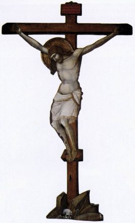 Il Crocifisso sagomato cortonese è databile intorno al 1315-20, nel periodo in cui Lorenzetti stava realizzando molte opere nella cittadina etrusca. Il Cristo viene rappresentato mentre sta esalando l’ultimo respiro. Ai lati sono rappresentati la Vergine e san Giovanni. L’opera è stata probabilmente eseguita su legno sagomato per creare un’immagine che desse l’impressione di una scultura.