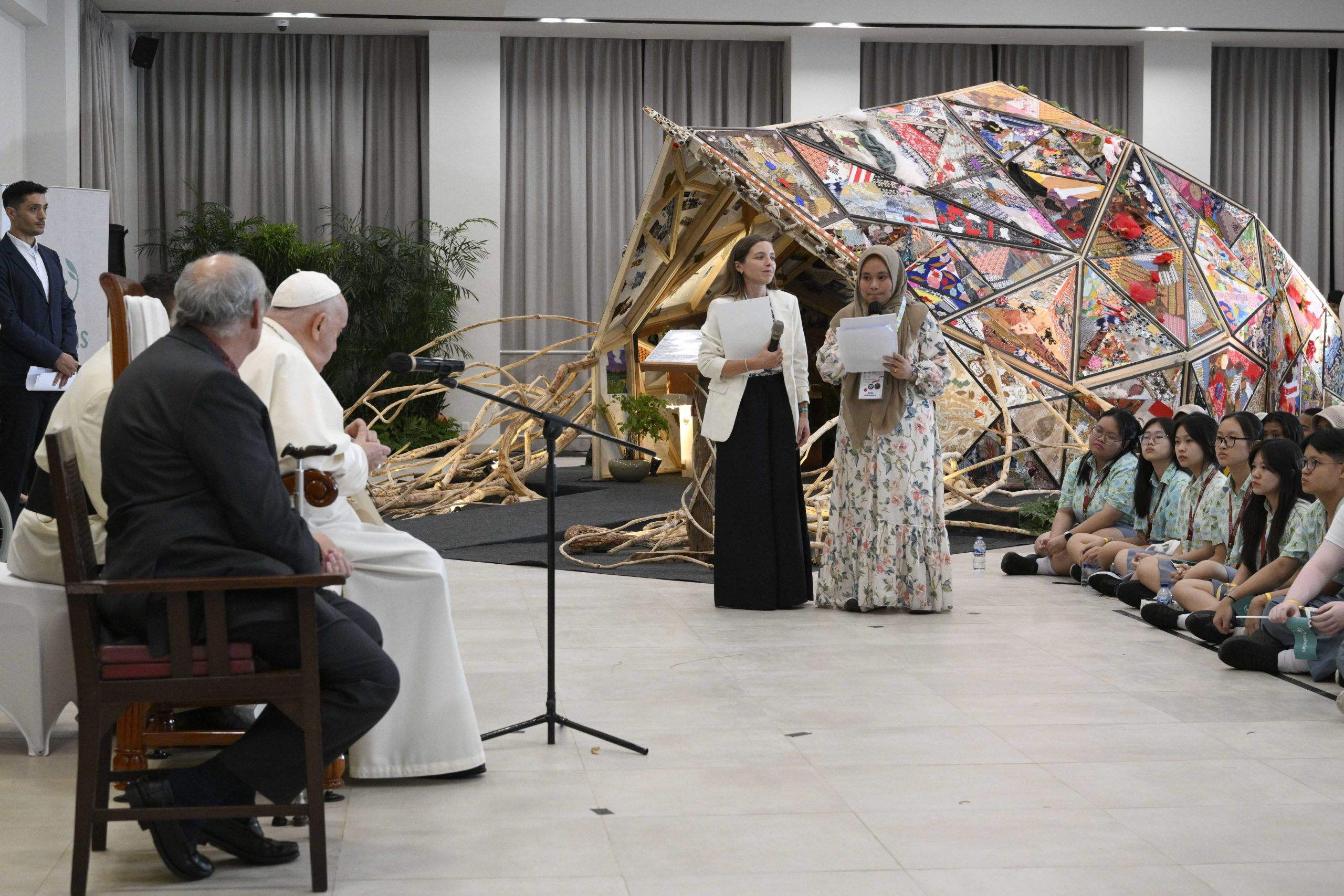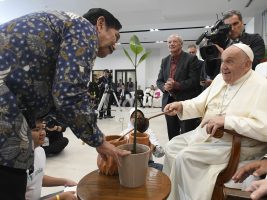 Al termine dell’incontro con i vescovi, i sacerdoti, i diaconi, i consacrati, le consacrate, i seminaristi e i catechisti, il Papa ha raggiunto la Casa della Gioventù Grha Pemuda, per l’incontro con i giovani di Scholas Occurrentes. Francesco viene accolto nel cortile antistante la Casa della Gioventù dai responsabili di Scholas Occurrentes e da 100 bambini dell’arcidiocesi di Giacarta. Due bambini gli offrono un dono, mentre gli altri intonano un canto. Poi, il Papa raggiunge la Sala Saint Mathias and Saint Tadeus, dove incontra i partecipanti al progetto “Scholas Aldeas”. Successivamente, viene accompagnato nella Sala Saint Jacob per un incontro privato con il Consiglio di Amministrazione di Scholas Occurrentes. Infine, il Santo Padre, dopo un breve colloquio con alcuni studenti, completa l’opera del poliedro realizzato dai giovani posizionando il pezzo finale. Al termine dell’incontro il Papa pianta un albero e impartisce la benedizione finale.