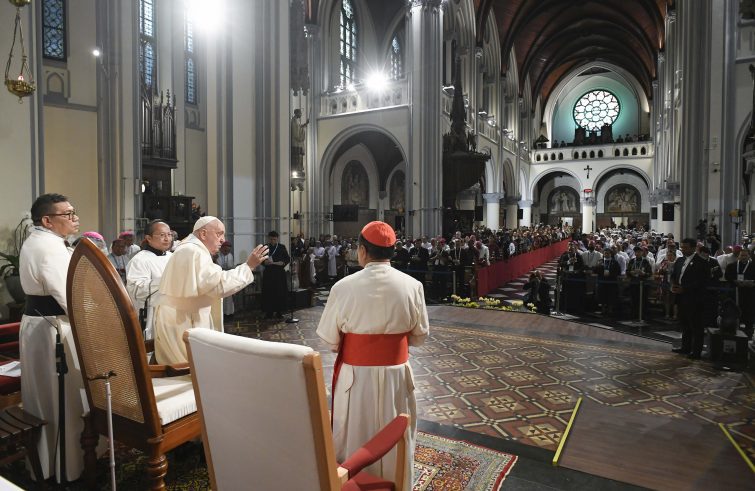 Compassione “vuol dire anche abbracciare i sogni e desideri di riscatto e di giustizia, prendersene cura, farsene promotori e cooperatori, coinvolgendo anche altri, allargando la rete e i confini in un grande dinamismo espansivo di carità”. Lo ha spiegato il Papa, al termine del discorso rivolto al clero, nella cattedrale di Giacarta, con numerosi inserti fuori testo. “E questo non vuol dire essere comunista, vuol dire carità, vuol dire amore”, ha precisato a braccio Francesco. Poi ha raccontato, sempre a braccio: “A me colpisce tanto quella storia del Vangelo, quando gli invitati a nozze non sono voluti venire. Il Signore cosa fa, si amareggia? No, manda i suoi e dice loro: ‘Andate agli incroci delle strade e portate tutti dentro: tutti!”. “Andare avanti con la fraternità, con la compassione, con l’unità”, l’invito finale: “Vi incoraggio a continuare la vostra missione forti nella fede, aperti a tutti nella fraternità e vicini a ciascuno nella compassione. Vi benedico e vi ringrazio per il tanto bene che fate ogni giorno!”.