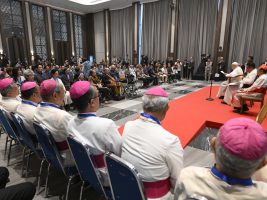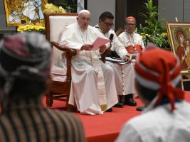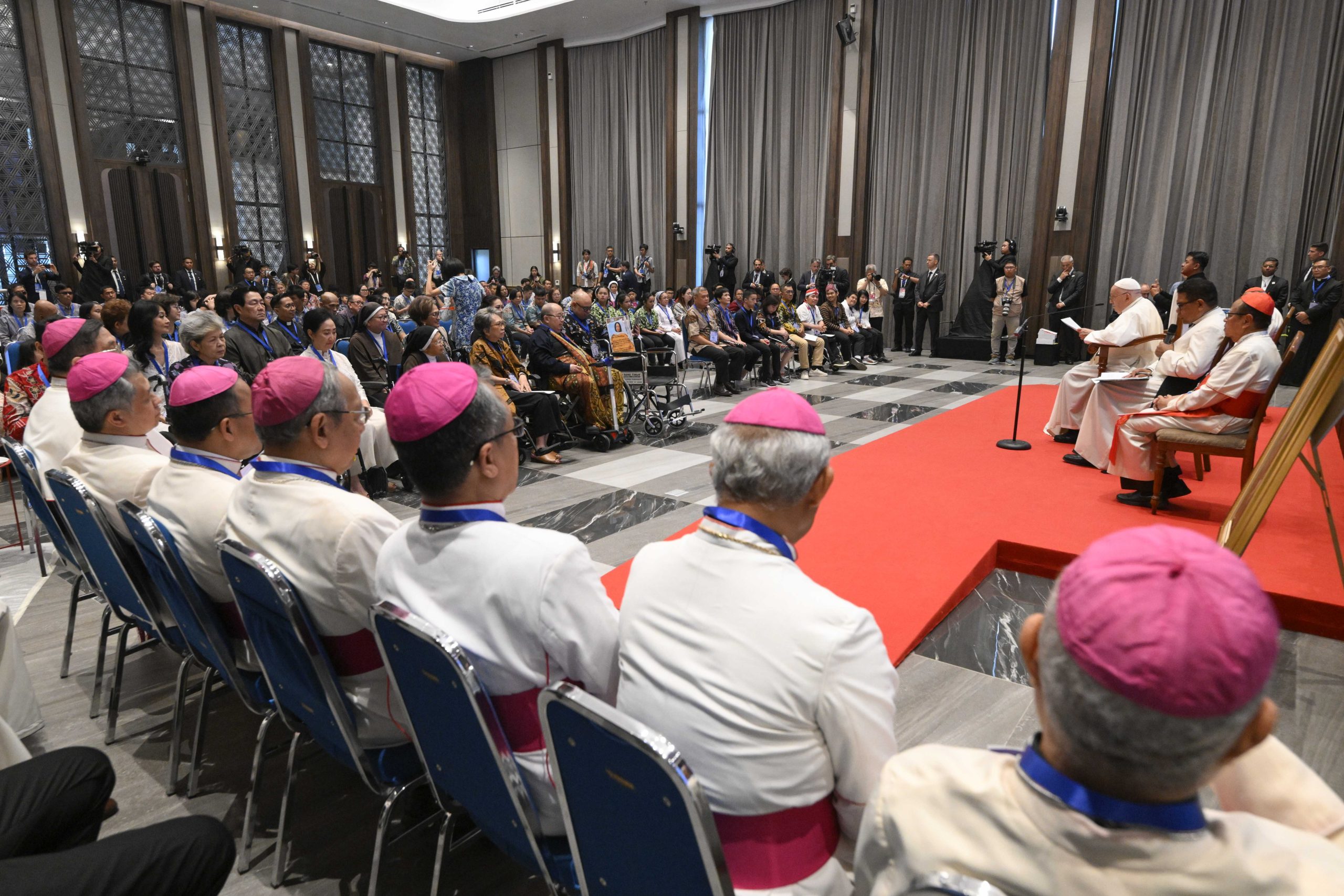 Dopo il saluto di benvenuto del presidente della Conferenza episcopale, mons. Antonius Franciskus Subianto Bunyamin, e le testimonianze di due persone con disabilità, l’incaricato della Commissione liturgica, mons. Henricus Pidyarto, ha guidato un breve momento di preghiera. Quindi il Santo Padre ha salutato personalmente e benedetto i presenti. Prima di lasciare la Henry Soetio Hall Francesco ha firmato la placca in marmo della sede della Conferenza episcopale per poi fare rientro alla nunziatura apostolica.