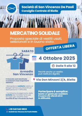Sabato 4 ottobre, dalle 9 alle 12, l’Armadio San Vincenzo, in via Don Minzoni 2/A, a Biella, apre le sue porte al pubblico per un mercatino solidale: verranno proposti vestiti usati, selezionati e in buono stato. L’offerta è libera.