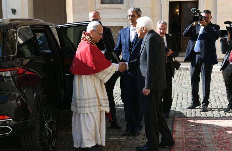 Papa Leone XIV è arrivato alle 10.40, con venti minuti di anticipo sulla tabella di marcia prevista, al Quirinale, dove è stato accolto dal presidente della Repubblica Italiana, Sergio Mattarella. Nel Cortile d’Onore, accanto al capo dello Stato, ha preso posto sul tappeto per gli onori, con l’esecuzione degli inni nazionali pontificio e italiano, al termine dei quali il Papa e il presidente hanno raggiunto la Sala del Bronzino per le foto ufficiali davanti alle bandiere e la presentazione dei rispettivi seguiti. Il colloquio privato tra il Santo Padre e il presidente della Repubblica è in programma nello Studio alla Vetrata; nel frattempo, le delegazioni vaticana e italiana si recano nella Sala del Druso per un colloquio parallelo. Terminato l’incontro privato, il Santo Padre e il presidente raggiungono la Sala degli Arazzi di Lille per lo scambio dei doni. Il Santo Padre dona al presidente un mosaico raffigurante il Colosseo, opera dello Studio del Mosaico Vaticano, e una copia autografata con dedica dell’esortazione apostolica Dilexi te. Il presidente dona un’acquaforte della seconda metà del XVII secolo, che riproduce la scultura di Alessandro Algardi (1598-1654) per l’altare di san Leone Magno nella basilica vaticana, e una biografia di santa Rosa da Lima del 1827. Nella Sala del Bronzino, Mattarella presenta al Papa i suoi consiglieri. Dopo una breve sosta nella Cappella dell’Annunziata, il Santo Padre e il presidente si recano nella Sala degli Specchi, dove li attendono il presidente del Senato, Ignazio La Russa, il presidente della Camera, Lorenzo Fontana, e il presidente del Consiglio dei ministri, Giorgia Meloni. Poi il culmine della visita, con i due discorsi – prima quello del capo dello Stato e poi quello del Santo Padre – che si terranno nel Salone degli Specchi.