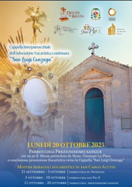 Sarà inaugurata lunedì 20 ottobre, alle ore 19,30 nella la chiesa di San Luigi Gonzaga a Ragusa, la cappella di adorazione eucaristica continuata. L’iniziativa sarà avviata con una messa solenne nella parrocchia del Preziosissimo sangue di Nostro Signore Gesù Cristo, presieduta dal vescovo di Ragusa, mons. Giuseppe La Placa. Al termine, una breve processione con il Santissimo Sacramento attraverserà le vie del quartiere, per giungere fino alla nuova cappella, dove mons. La Placa darà ufficialmente inizio all’adorazione. L’iniziativa coinvolge le comunità parrocchiali di San Pio X, Preziosissimo Sangue e SS. Nunziata, che garantiranno una presenza orante dalle ore 7 alle 20, dal lunedì al sabato. “Un segno visibile – si legge in una nota della diocesi – di comunione tra le parrocchie e di fede viva nella presenza reale di Cristo nell’Eucaristia”. La nuova cappella rappresenta una risposta concreta al desiderio di molti fedeli di trovare un luogo di silenzio, preghiera e incontro personale con il Signore. “È un dono per tutta la città – sottolinea la diocesi – e un’occasione per riscoprire la centralità dell’Eucaristia nella vita cristiana”.