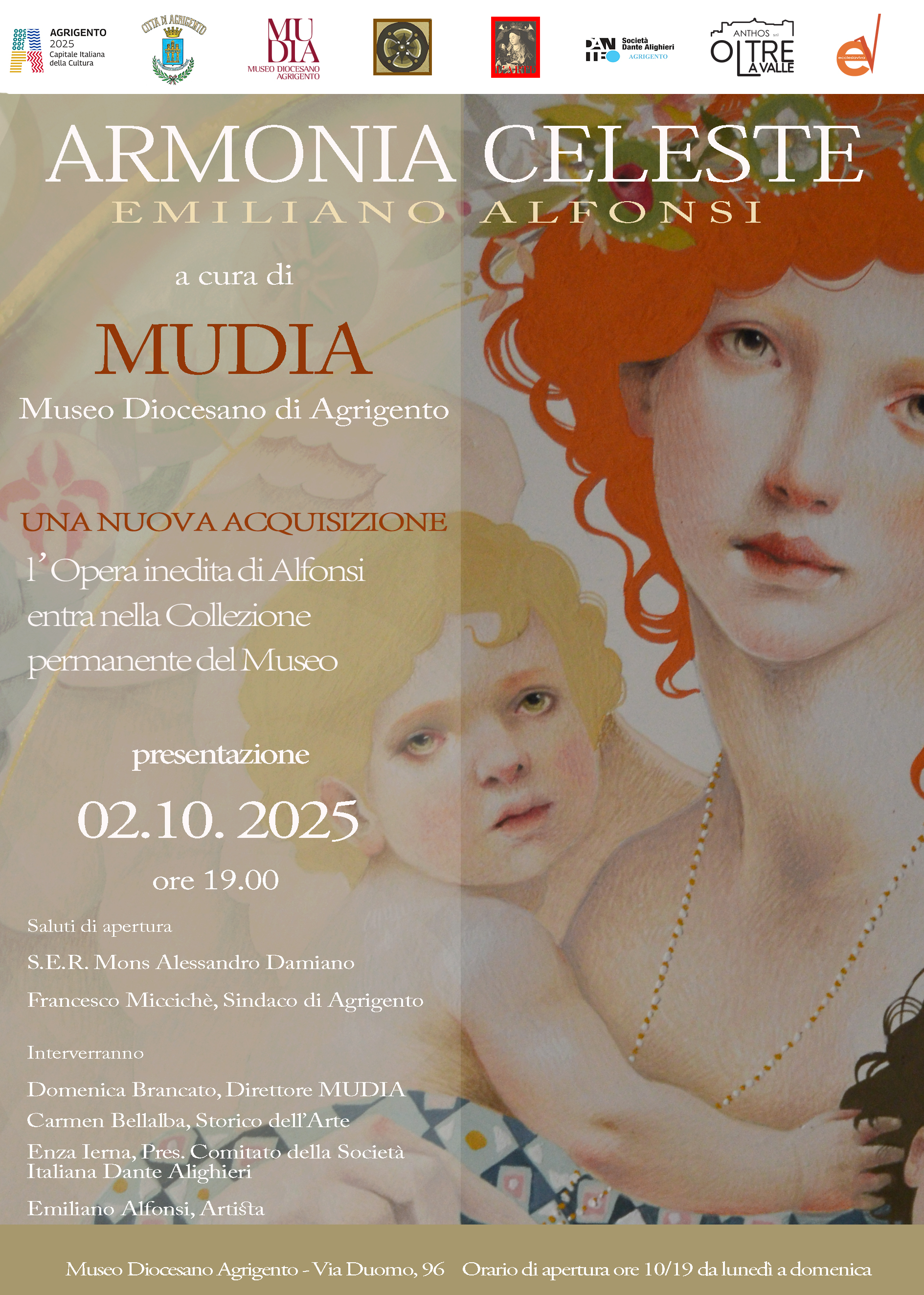 Sarà inaugurata oggi, giovedì 2 ottobre, alle ore 19, nel Museo diocesano di Agrigento, l’opera “Armonia celeste” dell’artista Emiliano Alfonsi. Il lavoro, inedito, entra a far parte della collezione permanente del Mudia, arricchendo il percorso espositivo con una nuova sezione dedicata all’arte contemporanea. Dopo l’esperienza del 2023 con la mostra “Sinopie”, Alfonsi torna al museo con un’opera pensata appositamente per lo spazio agrigentino. La direzione del Museo, guidata da Domenica Brancato, sottolinea il valore del dialogo tra opere antiche e contemporanee, come elemento di continuità e confronto culturale. L’autore descrive l’opera come una ricerca formale intorno all’idea di ordine e luce. Il titolo richiama la tradizione musicale legata alla dimensione celeste. Il riferimento agli angeli come strumenti e voci di un’armonia eterna introduce una riflessione sull’ascolto e sulla contemplazione. L’opera sarà donata al museo e resterà visibile all’interno della nuova sezione dedicata alla produzione artistica contemporanea. L’iniziativa si inserisce nel programma di attività del Mudia volte a promuovere il confronto tra linguaggi diversi all’interno di un contesto ecclesiale.