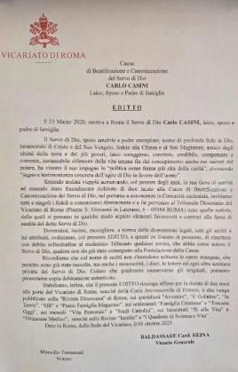 Con l’editto pubblicato ieri si invitano i fedeli a comunicare al “Tribunale diocesano del Vicariato di Roma (Piazza S. Giovanni in Laterano, 6 – 00184 Roma) tutte quelle notizie, dalle quali si possano in qualche modo arguire elementi favorevoli contrari alla fama di santità del detto servo di Dio”.
