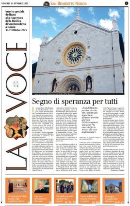 Un inserto speciale per raccontare la rinascita di un luogo simbolico della fede e dell’identità europea. In occasione della riapertura della basilica di San Benedetto a Norcia (30-31 ottobre), “La Voce”, settimanale di informazione dell’Umbria, dedica il numero in edicola venerdì 31 ottobre a uno speciale ricco di approfondimenti, testimonianze e immagini. A nove anni dal terremoto che ne aveva provocato il crollo, la basilica è stata restituita alla comunità con un intervento complesso che ha saputo coniugare fedeltà storica, innovazione tecnica e significato spirituale. Il titolo scelto – “Segno di speranza per tutti” – esprime il cuore di un evento che ha coinvolto la diocesi, la città di Norcia, le istituzioni e l’intero Paese. All’interno dell’inserto trovano spazio il racconto del rito di dedicazione, l’intervista all’arcivescovo Boccardo, la voce della comunità monastica, l’impegno degli enti locali e dei tecnici, fino alla gioia della popolazione. Uno sguardo viene riservato anche al messaggio benedettino che la basilica incarna, tra fede e cultura, radici e futuro.