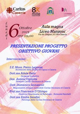 Sarà presentato lunedì 6 ottobre, alle 9, nell’aula magna del liceo statale Alessandro Manzoni di Caserta, il progetto interdiocesano “Obiettivo Giovani”, frutto della collaborazione sinergica tra la Caritas diocesana di Caserta e la Caritas diocesana di Capua. Il progetto, elaborato da un team multidisciplinare di professionisti, si rivolge in via prioritaria agli adolescenti nella fascia 14-18 anni, con particolare attenzione a quei giovani che vivono situazioni di disagio o sono a rischio di emarginazione. L’iniziativa coinvolgerà attivamente la popolazione studentesca di due importanti istituti del territorio: il liceo statale A. Manzoni di Caserta e l’Itis-Lf “F. Giordani” di Caserta.