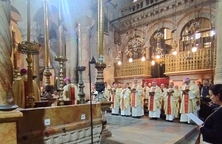 (da Gerusalemme) “Risorti con Cristo”, come si legge nella lettera ai Colossesi. Nell’omelia della messa celebrata questa mattina al Santo Sepolcro mons. Mario Delpini ha proseguito così la riflessione: “Con è la preposizione irrinunciabile. La risurrezione non è uno spettacolo da vedere, non è un fatto che si impone. È piuttosto una relazione, è la dimora dove possiamo, desideriamo, dobbiamo rimanere: Gesù risorto è con i suoi discepoli. L’essere-con di Gesù morto e risorto è il principio dell’umanesimo cristiano”. La risurrezione di Gesù “rivela – ha proseguito Delpini – che la speranza è autorizzata ed è proposta la via della salvezza. In questo tempo e in questa terra molti trovano buone ragioni per disperare della possibilità dell’umanità di sopravvivere: ci vogliono molte cautele – ci raccomandano – per sopravvivere. Ma coloro che sono con Cristo, risorti con lui, non possono semplicemente essere cauti per sopravvivere; devono piuttosto vivere, vivere in pienezza, vivere felici, vivere sempre, vivere e dare vita, vivere e fare della propria vita un dono”. Mons. Delpini ha infine ripreso una pagina degli Atti: “Questa è la parola che egli ha inviato ai figli di Israele, annunciando la pace per mezzo di Gesù Cristo: questi è il Signore di tutti”. E ha commentato: “Non possiamo tacere. Siamo inviati. Non per un progetto, per una obbedienza. Non per cercare consenso, per essere coerenti. Non perché siamo i migliori, ma per una incomprensibile vocazione a essere testimoni prescelti da Dio”. “Ci ha ordinato di annunciare al popolo e di testimoniare che egli è il giudice dei vivi e dei morti”. Dunque “queste parole siamo incaricati di pronunciare nello stesso discorso: figli di Israele, pace, Gesù. Sono tre parole difficili da pronunciare insieme, tre parole impopolari, ma noi questo dobbiamo dire. Questo siamo venuti a dire qui al sepolcro: per mezzo di Gesù, il risorto, sono stati riconciliati i popoli e a noi è stata affidata la parola della riconciliazione”.