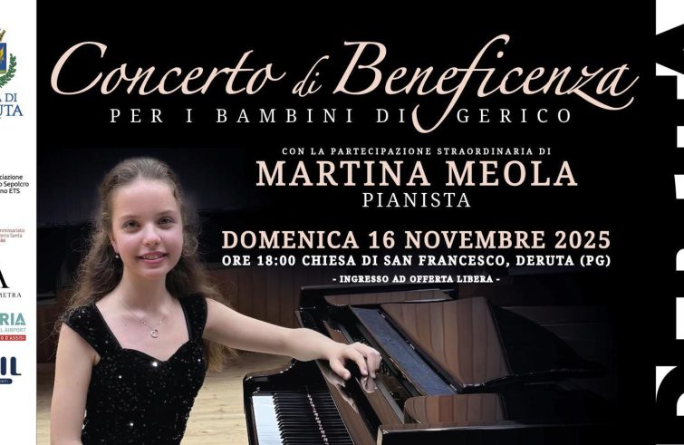 Terra sUn concerto per raccogliere fondi da destinare agli alunni della Terra Santa School di Gerico in Cisgiordania: a organizzarlo per domenica 16 novembre la città di Deruta, con il sindaco Michele Toniaccini e l’Associazione Santo Sepolcro Foligno presieduta da Lauretta Covarelli. Nella chiesa di San Francesco, in centro storico, alle ore 18 si esibirà la giovane pianista Martina Meola che si è distinta in molti concorsi di pianoforte, nazionali e internazionali. Le offerte andranno a sostenere i bambini di Gerico della scuola Terra Santa School che, spiegano dall’associazione Santo Sepolcro, vivono in una situazione alquanto difficile, in quanto la città è da due anni chiusa, la maggior parte delle attività sono ferme, le famiglie hanno difficoltà di vivere dignitosamente. Il Sindaco Toniaccini dichiara: “Con questo importante evento Deruta conferma la sua vocazione culturale e l’attenzione e sensibilità della comunità alla solidarietà e all’amicizia tra i popoli. Un’attenzione che nasce anche dalle iniziative di gemellaggio e di scambi artistici e culturali con le città della ceramica di tutta Europa”. Dal canto suo la presidente Covarelli auspica che questo concerto “Possa coinvolgere molte famiglie e tanti bambini per far conoscere la difficile realtà della Terra Santa”.