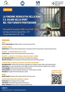 È in programma per mercoledì 19 novembre a Roma, dalle 10.30 alle ore 13, nell’Aula magna dell’Università europea, il convegno “La funzione rieducativa della pena e il valore dello sport nel trattamento penitenziario”, promosso dalla Fondazione Giovanni Paolo II per lo sport, dall’Università europea di Roma (Uer), dalla rete di magistrati “Sport e Legalità” e dal Csi Roma. L’incontro intende approfondire il contributo dello sport ai percorsi di recupero e reinserimento, in un’ottica di dignità della persona e di responsabilità civica, nel quadro dell’anno giubilare e della missione formativa dell’ateneo. Dopo i saluti del rettore, p. Pedro Barrajon, l’introduzione sarà affidata ad Aniello Marone, pro-rettore all’Internazionalizzazione e coordinatore del Cds in Giurisprudenza, mentre il professore associato di Diritto penale Carmelo Leotta offrirà una relazione sul significato rieducativo della pena. Seguiranno gli interventi istituzionali di suor Alessandra Smerilli, del Dicastero per il Servizio dello sviluppo umano integrale, e di Riccardo Turrini Vita, garante nazionale dei diritti delle persone private della libertà, dedicati al ruolo delle istituzioni nel dialogo tra sport e carcere. Una tavola rotonda riunirà rappresentanti di magistratura, amministrazione penitenziaria, mondo economico e sportivo per analizzare l’impatto della pratica sportiva nei percorsi detentivi. Nel corso della mattinata sarà presentata anche la seconda edizione dei “Giochi della Speranza”, iniziativa sportiva promossa all’interno degli istituti penitenziari. I lavori saranno moderati da Daniele Pasquini, presidente della Fondazione Giovanni Paolo II per lo sport e del Csi Roma.