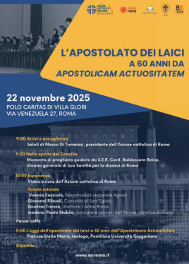 Nel 60° anniversario della promulgazione del decreto conciliare Apostolicam actuositatem sull’apostolato dei laici, l’Azione cattolica di Roma in collaborazione con la Caritas diocesana promuove sabato 22 novembre, alle ore 9 nel polo Caritas di Villa Glori in via Venezuela 27 a Roma, il convegno “L’apostolato dei laici a 60 anni da Apostolicam actuositatem”. “L’apostolato dei laici – si legge nel documento conciliare – non può mai venir meno nella Chiesa”. Partendo da questa affermazione, l’Azione cattolica intende non solo ricordare l’insegnamento del Concilio Vaticano II, ma attualizzarlo alla luce delle sfide contemporanee, riaffermando che la missione dei fedeli laici costituisce parte essenziale dell’azione evangelizzatrice della Chiesa. Aiuteranno la riflessione il card. Baldo Reina, vicario del Papa per la diocesi di Roma, e Stella Morra, teologa della Pontificia Università Gregoriana. Interverranno inoltre rappresentanti di Agesci Lazio, della Comunità di Sant’Egidio e della Caritas di Roma. Al termine della mattinata è previsto un momento conviviale con la possibilità di visitare gli spazi di Villa Glori. La partecipazione è libera, con iscrizione online al link: https://tinyurl.com/incontroapostolatodeilaici.