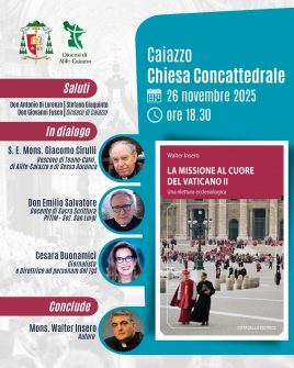 In occasione dei sessant’anni dalla conclusione del Concilio Ecumenico Vaticano II, il tema della missione rimane più che mai centrale per la vita della Chiesa e per il pontificato di Leone XIV, un Papa missionario. È in questo contesto che si inserisce la presentazione del volume “La missione al cuore del Vaticano II. Una rilettura ecclesiologica”, Cittadella Editrice, Assisi 2025, del teologo mons. Walter Insero, che si terrà il 26 novembre 2025 alle 18 presso la concattedrale di Caiazzo, nella diocesi di Alife-Caiazzo. L’incontro si aprirà con i saluti di don Antonio Di Lorenzo, don Giovanni Fusco e del sindaco di Caiazzo, Stefano Giaquinto. Questo volume, per mons. Insero, “nasce da una profonda gratitudine verso i Padri conciliari e dalla consapevolezza che la missionarietà ecclesiale deve essere nuovamente approfondita e riproposta in chiave ecclesiologico-sinodale, affinché possa incidere concretamente nella vita della Chiesa di oggi”. Una riflessione che partendo dall’insegnamento del Concilio, secondo quanto sviluppato dall’autore, “giunge fino al pontificato di Papa Leone XIV che nel suo saluto, appena eletto Papa, affermò: ‘Dobbiamo cercare insieme come essere Chiesa missionaria’, parole che confermano l’attualità del messaggio conciliare”. A dialogare sul tema saranno: mons. Giacomo Cirulli, vescovo di Teano-Calvi, di Alife-Caiazzo e di Sessa Aurunca; don Emilio Salvatore, docente di Sacra Scrittura (Pontificia Facoltà Teologica dell’Italia Meridionale – Sez. San Luigi) e Cesara Buonamici, giornalista e direttrice ad personam del TG5. L’incontro si concluderà con l’intervento dell’autore, mons. Walter Insero, sulle sfide della missione oggi, alla luce dell’eredità conciliare e del cammino sinodale.