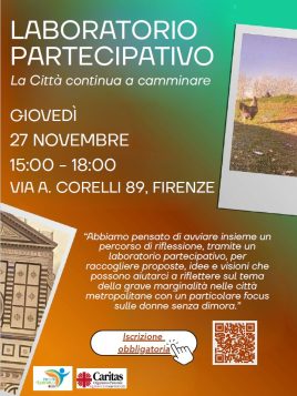 Giovedì 27 novembre, dalle 15 alle 18, Caritas Firenze organizza il secondo laboratorio partecipativo nell’ambito del progetto “Percorsi di Speranza”, un’iniziativa che vuole porre l’attenzione sulla grave marginalità nelle città metropolitane, con un focus speciale sulle donne senza fissa dimora.