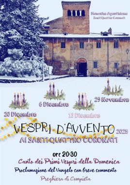 Le monache agostiniane del monastero dei Santi Quattro Coronati a Roma invitano ai Vespri d’Avvento, ogni sabato alle 20.30 (29 novembre, 6, 13 e 20 dicembre). Il programma prevede il canto dei Primi Vespri della Domenica, la proclamazione del Vangelo con breve commento e la preghiera di Compieta. L’iniziativa, aperta a fedeli e pellegrini, offre un tempo di raccoglimento e meditazione per vivere con intensità il cammino verso il Natale, in uno dei complessi monastici più suggestivi e spiritualmente fecondi della Capitale.