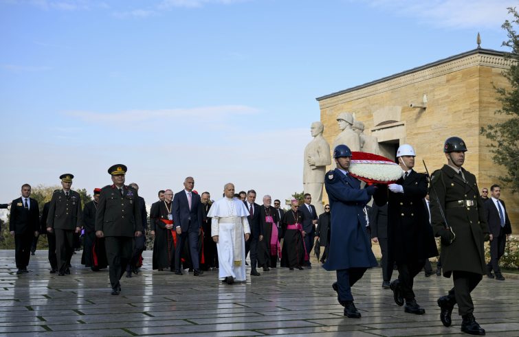 Alle 13 (ora locale, le 11 in Italia) il Papa ha lasciato l’aeroporto di Ankara per trasferirsi in auto al Mausoleo di Atatürk. Giunto al Mausoleo, viene accolto dal ministro, dal vicegovernatore di Ankara, dal comandante della guarnigione di Ankara, dal vicesindaco di Ankara, dal comandante del Mausoleo e dal direttore generale del protocollo, ai piedi delle scale all’inizio della Lion’s Road, il viale che conduce al Mausoleo, dove ha luogo la cerimonia di deposizione di una ghirlanda. Dopo la foto di gruppo con la delegazione, Papa Leone XIV si dirige verso la Torre Misak-ı Millî per la firma del Libro d’onore. Segue una breve visita al museo dedicato ad Atatürk e alla storia della Repubblica. Alle 14 (le 12 ora di Roma) il Santo Padre si trasferisce in auto al palazzo presidenziale dove, appena arrivato, viene scortato dalla cavalleria fino al cancello dell’ingresso principale. Il Papa viene accolto dal presidente della Repubblica, Recep Tayyip Erdogan, e insieme raggiungono il podio. Dopo gli inni, i 21 colpi di cannone, l’onore alle bandiere, la Guardia d’onore, la presentazione delle rispettive delegazioni e la foto ufficiale all’ingresso del palazzo presidenziale, il presidente e il Papa, attraverso l’ascensore, si dirigono al secondo piano del palazzo per una foto di gruppo con la delegazione turca e quella vaticana. Quindi si spostano nell’ufficio del presidente per l’incontro privato, la presentazione della famiglia e la foto con la famiglia. Alle 15.25 (13.25) Papa Leone si trasferisce in auto alla Nation’s Library per l’incontro con le autorità, la società civile e il Corpo diplomatico, occasione del suo primo discorso in Turchia, che pronuncerà in inglese.