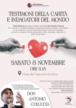 Sabato 8 novembre, alle ore 11.15, presso la chiesa dei Cappuccini di Urbino, il giornalista e scrittore Tiziano Mancini intervisterà don Antonio Coluccia, sacerdote salentino, fondatore dell’Opera Don Giustino, “simbolo di un cristianesimo che scende per le strade a combattere contro lo spaccio, la criminalità e l’abbandono sociale delle periferie”, sottolinea il direttore della Caritas diocesana, il diacono Luigi Fedrighelli.