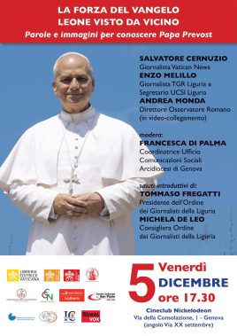 Venerdì 5 dicembre, alle ore 17.30, al Cineclub Nickelodeon, in via della Consolazione a Genova, è in programma l’incontro aperto al pubblico, con ingresso libero e gratuito, “Papa Leone visto da vicino”, in occasione dei primi sei mesi del Pontificato di Robert Francis Prevost.