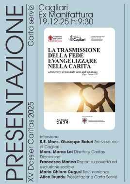 Si terrà venerdì 19 dicembre, alle 9.30 nei locali della ex Manifattura in viale Regina Margherita 33 a Cagliari, la presentazione del XV Dossier 2025 della Caritas diocesana, dal titolo “La trasmissione della fede. Evangelizzare nella carità. Immettere Cristo nelle vene dell’umanità. Papa Leone XIV”. L’iniziativa si colloca nel momento conclusivo dell’Anno giubilare. Nel corso dell’incontro saranno illustrati i dati del Rapporto diocesano su povertà ed esclusione sociale 2025, contenuto nel volume, con un’analisi dei principali bisogni rilevati sul territorio e delle risposte attivate dalla Chiesa di Cagliari attraverso la Caritas e le altre realtà diocesane impegnate accanto alle persone più fragili. “Questa pubblicazione – spiega don Marco Lai, direttore della Caritas diocesana – vuole essere un’occasione di riflessione sulle fatiche del nostro tempo, per condividere strategie e strumenti in un’ottica di rete e di risposte integrate”. Il dossier si arricchisce quest’anno di testimonianze legate al tema del dono e di una Carta dei servizi, pensata per orientare tra le iniziative promosse non solo dalle realtà ecclesiali, ma anche da quelle pubbliche e del Terzo settore, in una prospettiva di welfare comunitario. Alla presentazione interverranno l’arcivescovo di Cagliari, mons. Giuseppe Baturi, il direttore della Caritas diocesana, don Marco Lai, e il direttore del Centro studi/Osservatorio povertà e risorse, Francesco Manca. Seguiranno alcune testimonianze curate da Maria Chiara Cugusi e la presentazione della Carta dei servizi a cura di Alice Brundu.