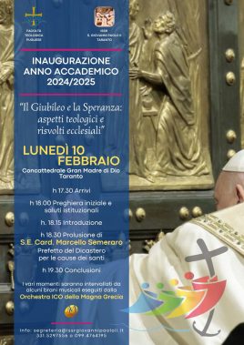 L’Istituto Superiore di Scienze Religiose di Taranto inaugura il nuovo anno accademico 2024/2025 lunedì 10 febbraio presso la concattedrale Gran Madre di Dio di Taranto a partire dalle ore 17:30. Il tema scelto per quest’anno è “Il Giubileo e la Speranza: aspetti teologici e risvolti ecclesiali”. A poche settimane dall’inizio del Giubileo, l’Istituto vuole proporre “una riflessione approfondita sul significato di questo evento, con un focus sulla teologia della speranza e sulle sue implicazioni per la vita della Chiesa e del mondo”. La prolusione inaugurale sarà tenuta dal cardinale Marcello Semeraro, Prefetto del Dicastero per le Cause dei Santi. Parteciperà l’Orchestra ICO della Magna Grecia, che eseguirà brani selezionati per accompagnare e sottolineare i diversi momenti della cerimonia.